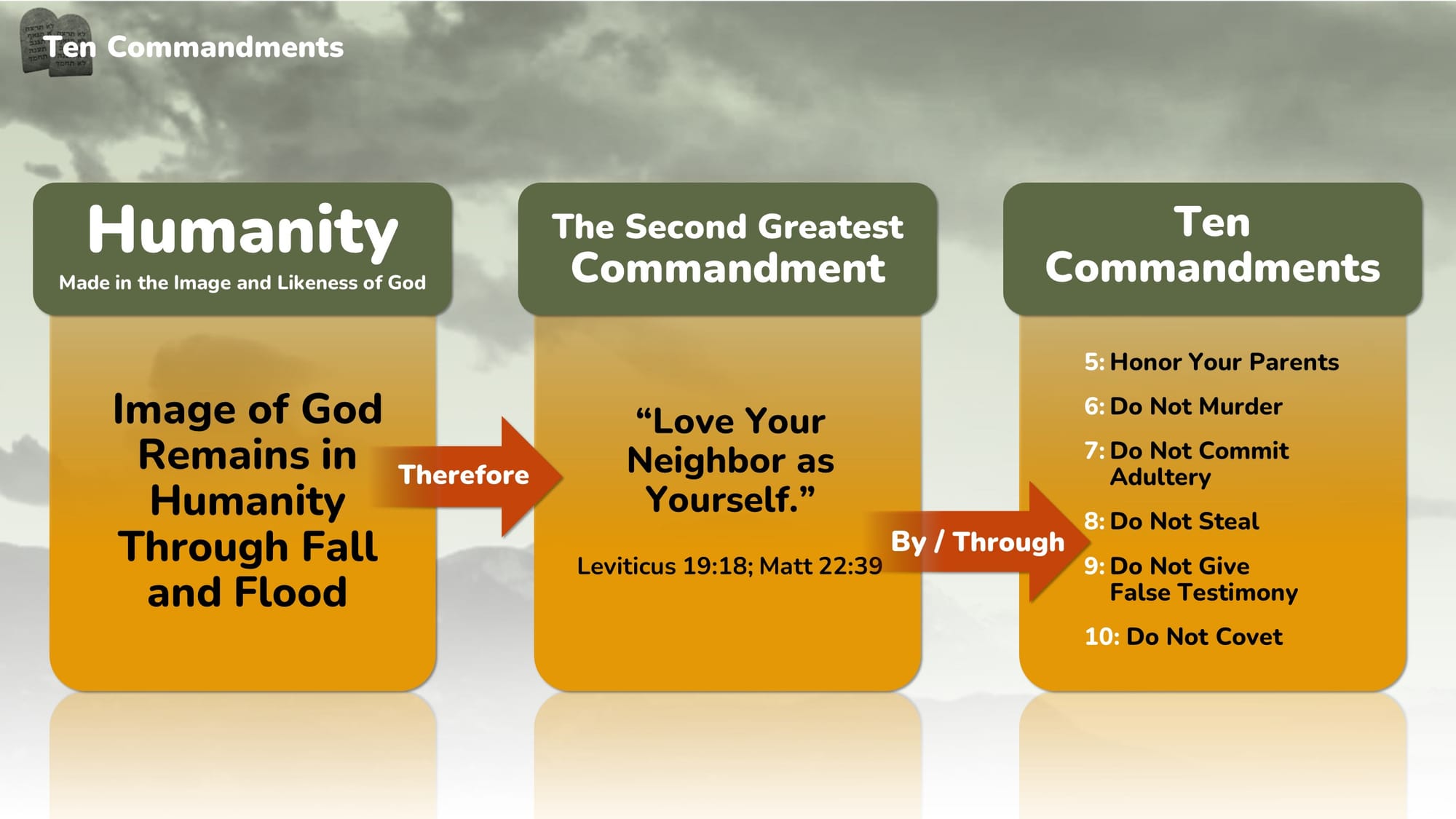 Reflection: The preamble to the ten commandments reminds us that God loved us and saved us first, therefore we should respond with love and obedience by obeying the ten commandments. Then the first four commandments may be summarized as "Love the Lord your God with all your heart, with all your mind, and with all your soul." And the sixth through tenth commandments are "love your neighbor as yourself." The way we love our neighbor is by being God's steward and our neighbor's servant. To live these commandments, to apply them to my life, I must spend quality time with God each day. There are many spiritual disciplines that can help me focus on God, but the core ones are prayer, scripture and worship. Therefore, five days a week I will get up at 5am, begin my quiet time with prayer, then read one chapter of the bible, and then journal on it. After I get the kids out the door for school I will workout for 30 minutes while listening to worship music. This morning discipline will help me make God my first priority in 2026, it will help me to apply the ten commandments to my life each day.