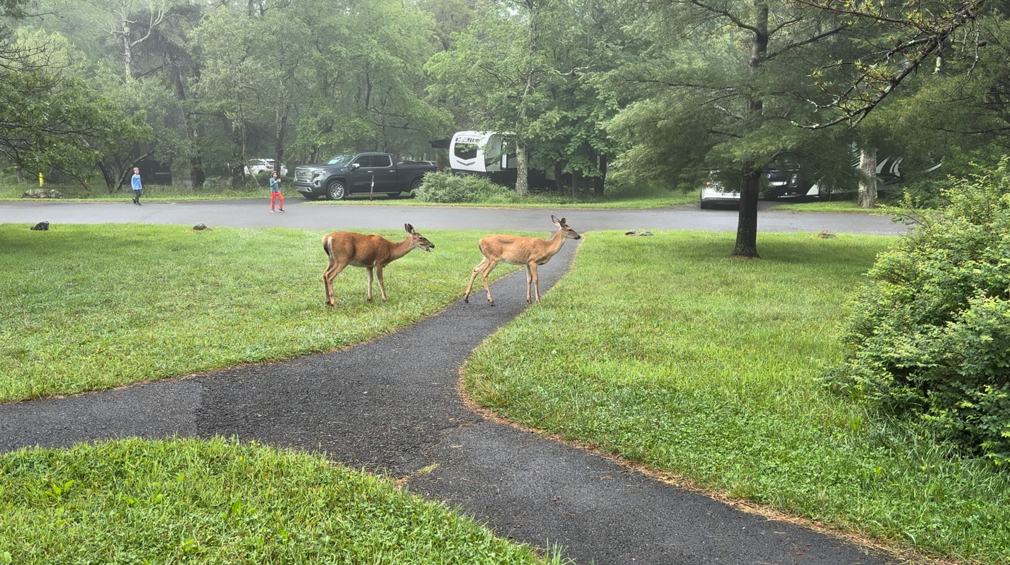 Shenandoah National Park: We arrived at Shenandoah last night - during another rain storm! We are due for more rain tonight - the weather at Colonial Williamsburg was wonderful, while we we sleeping in a hotel - but stormy at Great Smoky Mountains and Shenandoah while we're camping. We've seen deer, birds and TOADS! The kids love the toads. We are at Big Meadows Campground which is expansive, with many sites close together. Our site looks further away than others (and it is) but it is still surrounded by tent campers. We are looking forward to hiking and visiting the visitor center today!